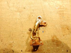 Hier der Fockbaumbeschlag. Der Schäkel und der Wirbel sind Kaufteile, während der Augbügel und die Halterung für den Fockbaum selbst angefertigt wurden.