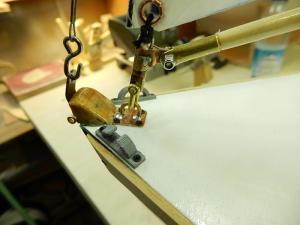 Die Wantbeschläge entstanden ebenfalls aus Kupferblech. Der Stift, der das Want hält, ist auch wieder vernietet worden, bevor die beiden Bleche miteinander weich verlötet wurden. Mit dem Proxxon- Gasbrenner einfach draufhalten, bis das Blech blank wird: die richtige Löttemperatur ist erreicht. Dann die Flamme wegnehmen und das Lötzinn an die Nähte halten. Es flutscht quasi von selbst in die Trennfuge. Warten bis alles kalt ist und schon kann es mit dem Bohren der Löcher und dem Verputzen mit der Feile weitergehen.