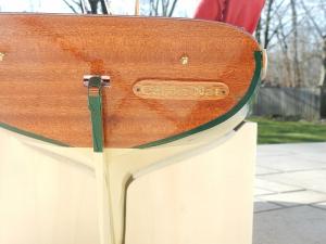 Das Namensschild besteht aus wasserfestem Mahagonisperrholz, dessen Oberfläche mit Epoxidharz versiegelt ist. Die Buchstaben sind handgeschnitzt, mit goldener Revell Farbe ausgemalt und nach dem Trocknen der Farbe geschliffen. Voilá!