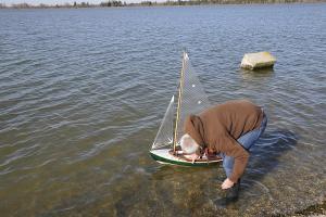 Zu allem Übel frischt der Wind auf 4 Bft auf, und der See ist teilweise bereits mit Schaumkronen bedeckt. Das Gewässer ist ein Stausee, etwa 1 km lang und halb so breit, den man zu Fuß umgehen kann, was für Klaus und CAPTN NAT ein langer Weg bedeutet. Der 12 ½ - Footer läuft nun raumschots stabil vor dem Wind ab, genau in Längsrichtung des Sees. Am anderen Ufer angekommen, bekommt Klaus wieder Sicht- und Funkkontakt zu seinem Boot. Nach diesem Feuerritt über die mittlerweile 30 cm hohen Wellen war noch kein Tropfen Wasser im Cockpit. Allerdings steuert das Modell auf die Felsbewehrung des Stausees zu, und das noch an einer Stelle an der dichtes Gebüsch das Ufer säumt. Klaus versucht steuernd einzugreifen: ein Fehler, denn gerade als er angeluvt hat, kommt eine Bö und legt die CAPTN NAT ordentlich auf die Seite, so dass gute 3 Liter Wasser den Weg ins Cockpit finden. Gleich danach macht die schöne Bootslackierung Bekanntschaft mit den Felsen, und Klaus mit dem Gestrüpp.
