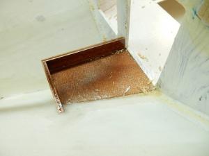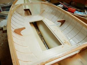 Anschließend hat er neue Decks aus 0,6 mm Birkensperrholz gebaut, das er einseitig mit 80 g/m² Glasmatte beschichtet hat. Er hat sehr üppig Harz verwendet und es mit den Fingern in die Matte massiert. Das ergab ein dichtes Laminat mit einer Gewebestruktur, so wie es sein soll. Vor dem Einkleben bekommen die Deckshälften Verstärkungen für die Umlenkrolle des Fockholepunkts.