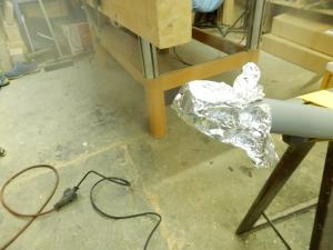 Am Dampftapetenablöser hat Klaus den Schlauch abgeschnitten und statt der Platte ein PVC-Rohr angeschlossen, das schräg an einem Bock befestigt ist. Das Rohr ist am oberen Ende mit etwas Alufolie verschlossen. Die Folie bekommt ein Loch, damit der Dampf raus kann, die Wärme aber nicht.