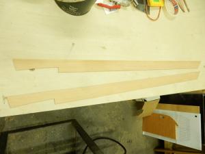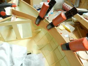 Weiter oben wurden schon einmal eingebogene Spanten erwähnt. Sie bestehen aus 2 x 3 mm Hartholz und brechen gnadenlos ab, wenn man versucht sie kalt an Ort und Stelle in Form zu bringen. Nicht aber, wenn man sie 3 Minuten kocht und dann einbiegt, oder über eine Form biegt, wie Klaus das gemacht hat. Eine Nacht trocknen lassen und die Leisten sind so krumm wie man sie haben möchte und trotzdem sehr stabil.