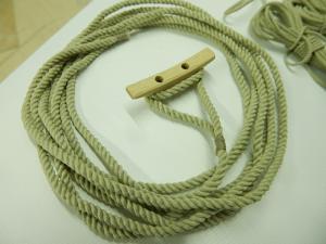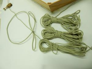 Das laufende Gut ist auch eingetroffen. Hier sehen wir das Gaffelfall, das Piekfall und das Fockfall. Ersteres aus 1,5 mm Tauwerk und letzteres aus 1,2 mm Tau. Das Tauwerk stammt von unserem Minisail-Classic-Kollegen Andreas Gondesen, der eine professionelle Modellseilerei betreibt und erstklassige Qualität liefert.