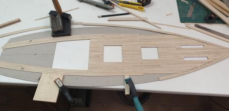 Die Decksplanken werden auf eine Kartonschablone geklebt.
