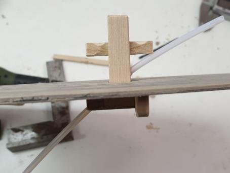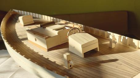 Weitere Decksaufbauten werden erstellt und platziert. Im Vordergrund ist im Betingspfosten die Austrittsöffnung der Großschot zu sehen. Sie wird später mit Tauwerk kaschiert.