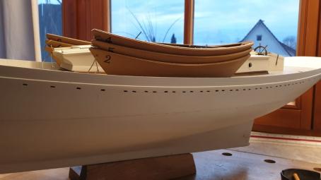 Das Deck ist inzwischen eingeklebt und der Wassergang sowie das Schanzkleid mit den Stützen weiß gestrichen.
