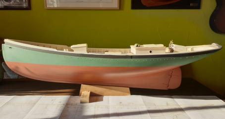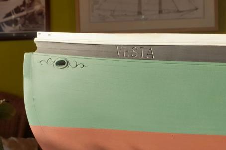 Im Bereich der Klüsen wird außenbords noch eine für die amerikanischen Fischerboote typische, in die Beplankung eingeschnitzte Verzierung angebracht.