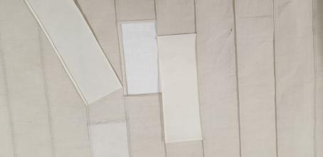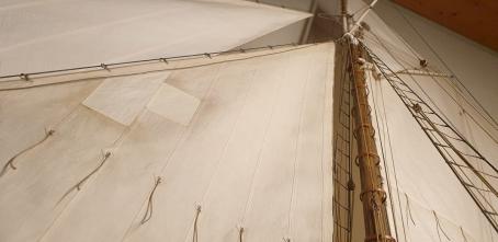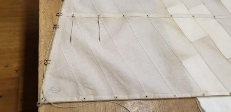 Zweiter Anlauf: Der verwendete Baumwollstoff FB200 ist so fein und leicht, dass er zum Nähen mit handelsüblichem Tapetenkleister gestärkt werden muss. Er hat dann eine papierähnliche Konsistenz und lässt sich so masshaltig falten und schneiden. Die Darstellung der einzelnen Segelbahnen werden durch eine Z-Naht realisiert. Die eingesetzten Stoffbahnen an den reparierten Stellen müssen extra eingenäht werden, denn sie sollen sich farblich deutlich vom alten Segeltuch absetzen.