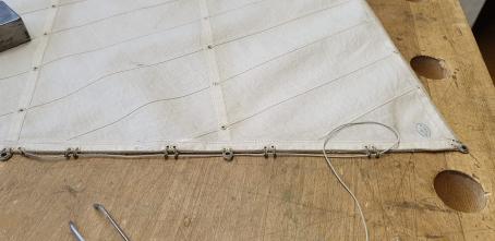 Das Großsegel wird hier mit einer Reffleine ausgestattet. Im gespannten Zustand fixiert sie das Segel mit den Mastringen am Mast. Wird das Segel aber gerefft und die Reffleine dadurch locker, gibt sie dem Großsegel die Möglichkeit, sich nach achtern zu entspannen.