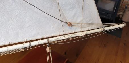 Das Großsegel ist jetzt umsäumt und hat, neben weiteren Verstärkungen, zwei Reffbänder erhalten. Es besitzt einen leichten Bauch, steht faltenfrei und zeigt keinerlei Verzug. Unser Modellbauer hat es zur Probe angeschlagen, und nicht nur er ist mit dem Ergebnis sehr zufrieden.