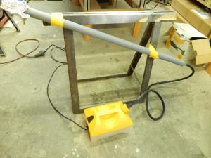Am Dampftapetenablöser hat Klaus den Schlauch abgeschnitten und statt der Platte ein PVC-Rohr angeschlossen, das schräg an einem Bock befestigt ist. Das Rohr ist am oberen Ende mit etwas Alufolie verschlossen. Die Folie bekommt ein Loch, damit der Dampf raus kann, die Wärme aber nicht.