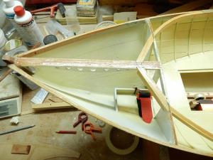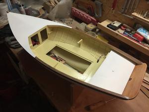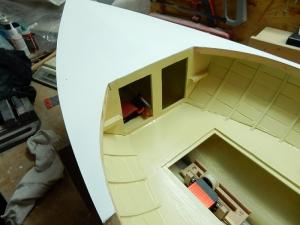 In den letzten Wochen hat Klaus viel Zeit in die beiden Vordecks investieren müssen. Sie sind aus Depron, leicht und optisch perfekt, aber der GfK ist nicht dicht. Beim Lackieren sieht erst mal alles gut aus, aber nach einer halben Stunde hat man lauter Löcher drin. Nach der fünften Grundierung hat Klaus doch zum Filler gegriffen. Der hat die Löcher gestopft, aber das Depron darunter angelöst, so dass die Decks wellig geworden sind. Schweren Herzens hat er die Deprondecks entsorgt.