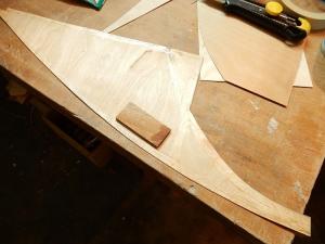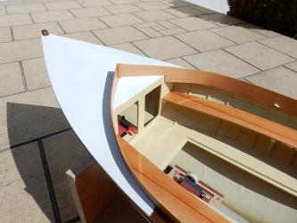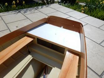 Anschließend hat er neue Decks aus 0,6 mm Birkensperrholz gebaut, das er einseitig mit 80 g/m² Glasmatte beschichtet hat. Er hat sehr üppig Harz verwendet und es mit den Fingern in die Matte massiert. Das ergab ein dichtes Laminat mit einer Gewebestruktur, so wie es sein soll. Vor dem Einkleben bekommen die Deckshälften Verstärkungen für die Umlenkrolle des Fockholepunkts.