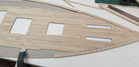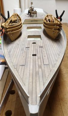 Das Deck ist inzwischen eingeklebt und der Wassergang sowie das Schanzkleid mit den Stützen weiß gestrichen.