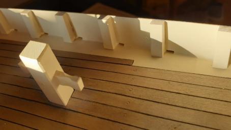 Weitere Decksaufbauten werden erstellt und platziert. Im Vordergrund ist im Betingspfosten die Austrittsöffnung der Großschot zu sehen. Sie wird später mit Tauwerk kaschiert.