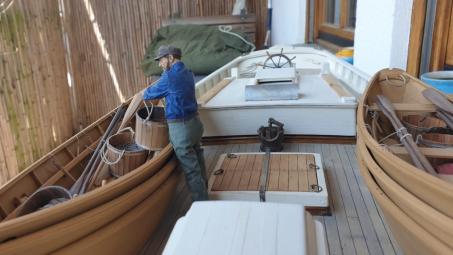 Der Skipper ist nun auch schon an Bord (noch etwas früh). Nicht nur die Dories, auch der Steuerkasten steht schon an seinem Platz.