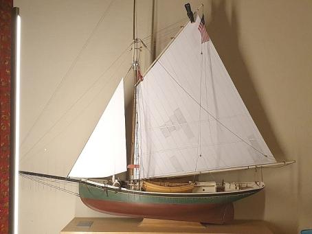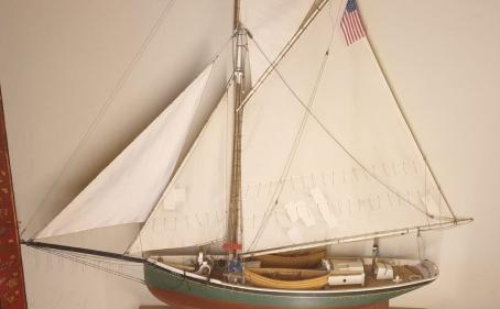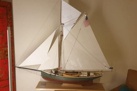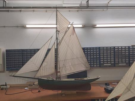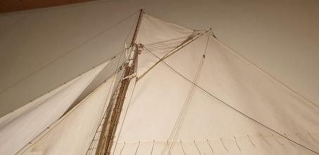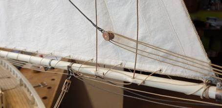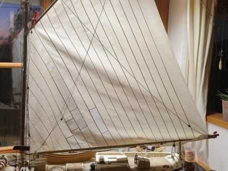 Das Großsegel ist jetzt umsäumt und hat, neben weiteren Verstärkungen, zwei Reffbänder erhalten. Es besitzt einen leichten Bauch, steht faltenfrei und zeigt keinerlei Verzug. Unser Modellbauer hat es zur Probe angeschlagen, und nicht nur er ist mit dem Ergebnis sehr zufrieden.