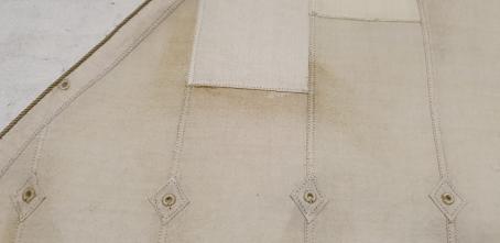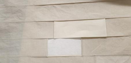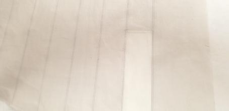 Zweiter Anlauf: Der verwendete Baumwollstoff FB200 ist so fein und leicht, dass er zum Nähen mit handelsüblichem Tapetenkleister gestärkt werden muss. Er hat dann eine papierähnliche Konsistenz und lässt sich so masshaltig falten und schneiden. Die Darstellung der einzelnen Segelbahnen werden durch eine Z-Naht realisiert. Die eingesetzten Stoffbahnen an den reparierten Stellen müssen extra eingenäht werden, denn sie sollen sich farblich deutlich vom alten Segeltuch absetzen.