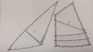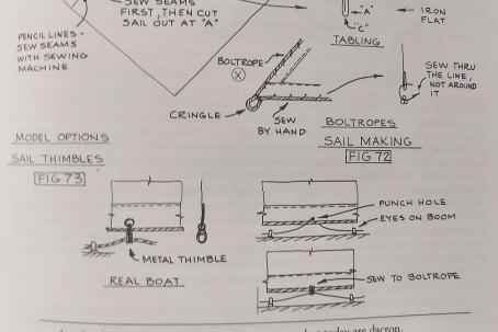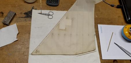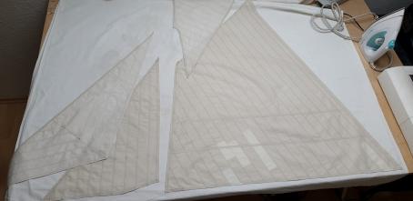 Nach dem das Großsegel fertig genäht ist, fehlen jetzt noch die beiden Vorsegel und das Gaffel-Topsegel. Auch ihre Größe und Form wird, wie schon geschildert, mit Kartonschablonen ermittelt.