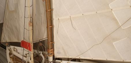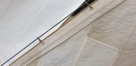 Das Großsegel wird hier mit einer Reffleine ausgestattet. Im gespannten Zustand fixiert sie das Segel mit den Mastringen am Mast. Wird das Segel aber gerefft und die Reffleine dadurch locker, gibt sie dem Großsegel die Möglichkeit, sich nach achtern zu entspannen.