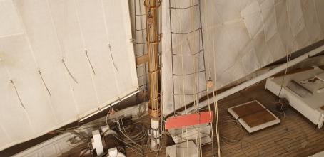 Im Schiffsinneren gibt es genug Raum für die Schotdurchführungen und eine Fundamentplatte, in der Gewindebuchsen zur Befestigung der Windenmodule schon passend eingelassen sind. Diese Module werden durch die Kajütaussparung in den Rumpf eingelegt und dann in ihre Position geschoben. Die Fockwinde kann durch eine Aussparung für den Niedergang hinter dem Mast mit der Fundamentplatte verschraubt werden. Für die folgende Großschotwinde gilt das Gleiche, sie wird aber durch die Ladeluke verschraubt. Das Bild links zeigt mit Blickrichtung zum Bug die im Rumpf befestigte Fundamentplatte mit einer Aussparung in der Bildmitte für den Akku. Am linken Bildrand ist die Schotdurchführung aus Messingrohr für die Klüverschot zu sehen.