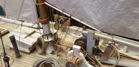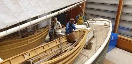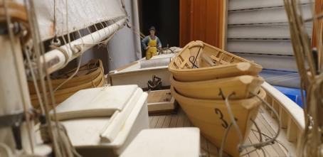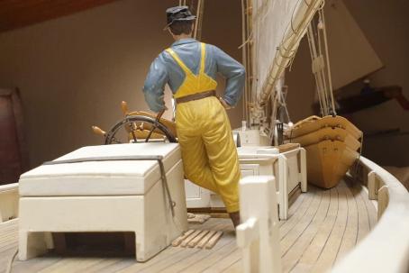 Eigentlich wären jetzt nur noch die Schoten mit den schon vorhanden Segelwinden zu verbinden und abzustimmen, was aber pandemiebedingt auf einen späteren Zeitpunkt verschoben werden muss. Statt dessen heuert Wolfgang ein weiteres Crewmitglied an, einen russischen Panzersoldat im Maßstab 1:16. In diesem Maßstab gibt es auf dem Markt eine große Anzahl an ausgezeichneten Figuren, die aber meist überarbeitet werden müssen. Mit etwas Schnitzarbeit und Farbe macht so auch ein desertierter russischer Soldat als lässiger amerikanischer Fischer eine gute Figur.