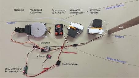 Vor dem Einbau wurde die komplette RC-Anlage auf einem Arbeitstisch komplett aufgebaut, verschaltet und auf Funktion geprüft. Die Komponenten wurden so platziert, wie sie später im Rumpf angeordnet sind. Dabei stellte sich raus, dass die eingesetzten Segelwinden vom Typ Windforce 106MG mit der im Bild dargestellten Stromversorgung durch sechs AA-Batteriezellen mit 1,5 Volt nicht klarkommen. Setzt man stattdessen die größeren Sub-C-Zellen ein, funktionieren die Winden tadellos: sie sind kräftig und schnell.