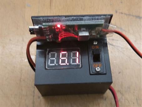 Für die Stromversorgung an Bord wurden der EIN-AUS-Schalter, die Spannungsanzeige und eine UBEC-Elektronik zur elektronischen Spannungsregelung in einer Kunststoffbox zu einer Baugruppe zusammengefasst. Die Stromversorgung übernimmt ein 5-zelliger NiMH-Akkublock mit einer Kapazität von 2.400 mAh. Seine Spannung (6 - 7,5 Volt) wird durch ein Voltmeter überwacht. Die UBEC-Elektronik dagegen stellt eine konstante Spannung für die RC-Komponenten von 6 Volt bereit.