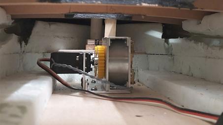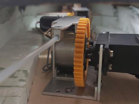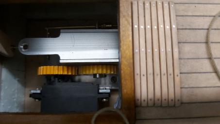 Zu guter Letzt wird nun auf dem etwas erhöhten Kajütboden das Windenmodul für die beiden Klüverschoten verschraubt. Direkt vor dem Modul münden 2 Teflonröhrchen in ein Winkelprofil aus Messing, in denen die Schoten nach vorne geführt werden, wo sie hinter je einem Belegnagel versteckt am Schanzkleid zu Tage treten.