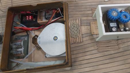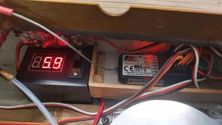 Gut zugänglich an der Steuerbordseite unter der Kajüte wird jetzt die schon angesprochenen Baugruppe mit dem EIN-AUS-Schalter und dem Voltmeter eingebaut. Direkt dahinter ist der Empfänger mit einem Klettband in einer Holzbox fixiert.