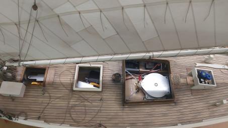 Hier noch einmal ein Gesamtüberblick, der den einfachen Zugang zur jetzt komplett eingebauten RC-Anlage gut erkennen lässt. Ganz links sieht man durch den Decksdurchbruch des Niedergangs die Fockwinde, rechts daneben die unter der Ladeluke sitzende Großschotwinde. Durch die abgenommene Kajüte erkennt man die Winde für die Klüverschoten, den Empfänger und die Stromversorgung, während ganz links im Steuerkasten das Ruderservo zu sehen ist.